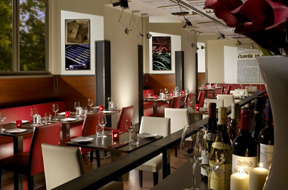 Hotel sám nabízí příjemné prostředí jak v restaurační, tak ubytovací části. Kdo si pospíší s registrací, může získat i pokoj ve vyšších patrech s výhledem na Petřín, případně terasou. Místnosti jsou zde oproti jiným moderním hotelům atypické. Zejména mají vysoké stropy a vysoká velkoformátová okna. Je to dáno tím, že se jedná o historický památkově chráněný objekt postavený v roce 1907 pro potřeby největšího tiskařského provozu v tehdejší monarchii a později i v Československu. Reprografické provozy potřebovaly vždy kromě jiného dostatek světla. Hlavní budovu tiskárny, moderně konstruovanou v železobetonovém skeletu a elektricky vybavenou, postavil František Zvěřina. Secesní fasádu navrhl Karel Hermann a je jednou z mála dochovaných ukázek secesní architektury u nás. Více o historii objektu na Česká grafická unie.