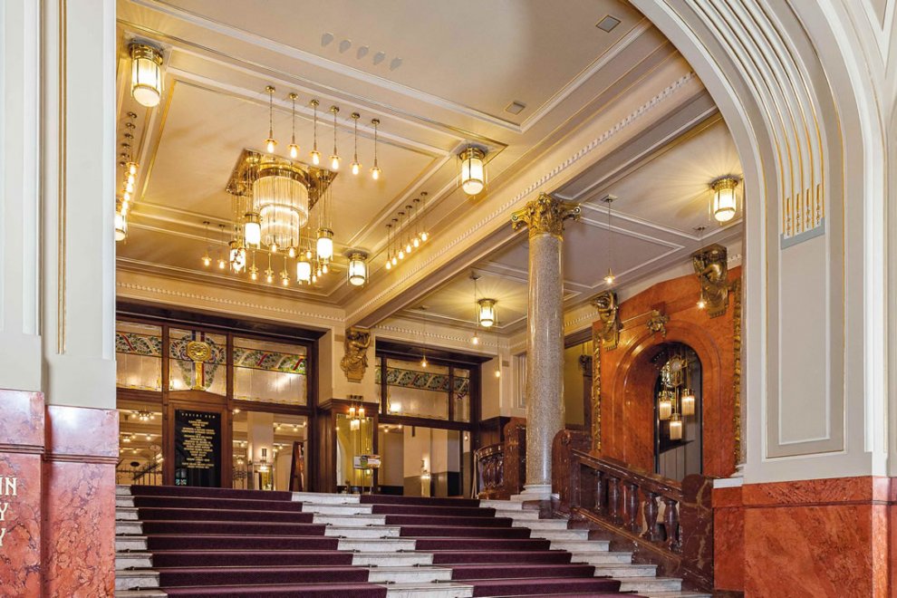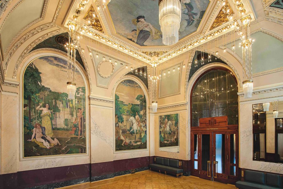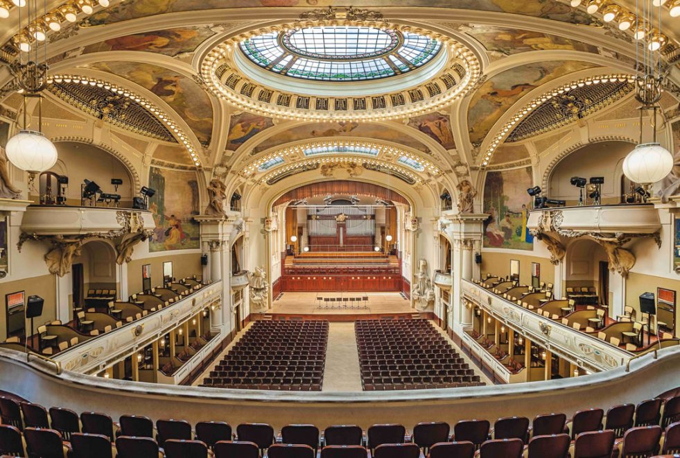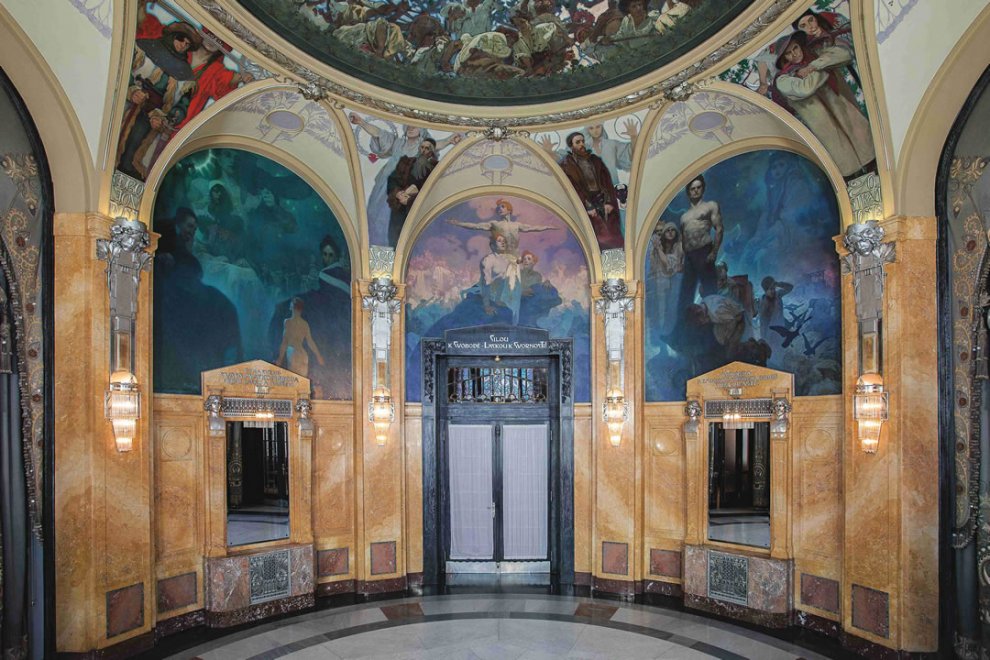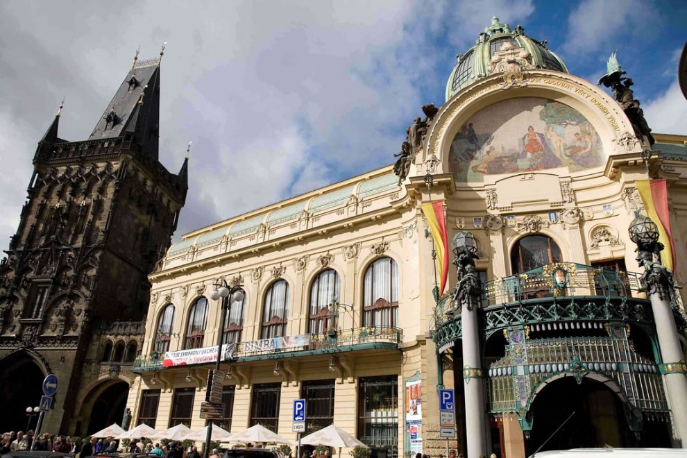 Obecní dům byl vystavěn podle plánů architektů Antonína Balšánka a Osvalda Polívky v letech 1905 –1912 a je nejvýraznější komplexní ukázkou secese jak v exteriéru, tak interiéru, která se dochovala v původním stavu. Na jeho výzdobě se podíleli nejvýznamnější čeští malíři a sochaři počátku 20. století: Mikoláš Aleš, Max Švabinský, František Ženíšek, Ladislav Šaloun, Karel Novák, Josef Mařatka, Josef Václav Myslbek, Alfons Mucha a Jan Preisler. Průčelí dominuje půlkruhová mozaika sestavená podle kresby Karla Špillara. Dlužno podotknout, že všechny kovové prvky (lustry, zábradlí, ozdobné prvky, kování dveří apod.) byly vyrobeny v kovozpracujícím závodě Franty Anýže, pozdějšího člena Rotary klubu Praha. Největší sál Obecního domu, Smetanova síň, pojme až 1200 hostů. Další sály mají různou kapacitu i užití. Celkem je zde 1240 místností. Rozsáhlá rekonstrukce se uskutečnila v letech 1994–1997.